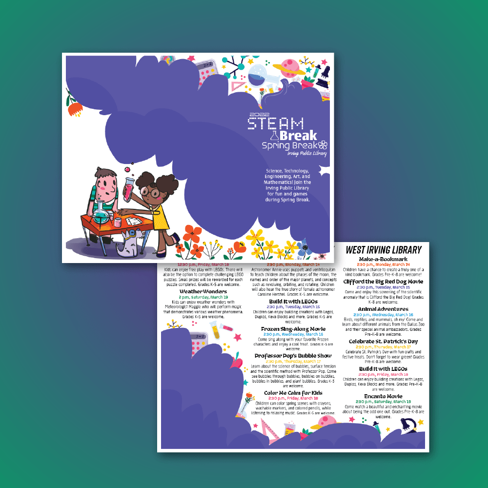 Irving Public Library was doing a STEAM themed Spring Break that I got to make the brochure for. STEAM is STEM with the addition of Art, so Science, Technology, Engineering, Art, and Math. The library usually has a ton patrons come in during any school break but I wanted to excite them too by making everything super colorful and bright. I love the way the little group of kids and their dog came out!